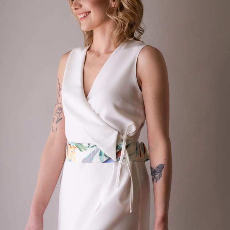 Jest to asymetryczny fartuszek, o prostym kroju, wiązany na troczki, dzięki czemu w łatwy sposób można dostosować szerokość. Wewnętrzny troczek przeciąga się przez otwór po prawej stronie ciała i wiąże się z tyłu.