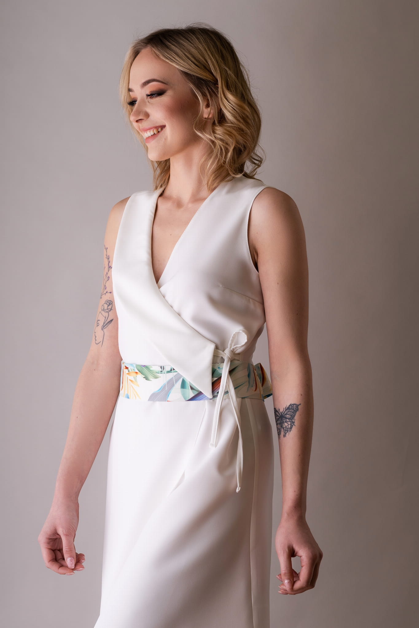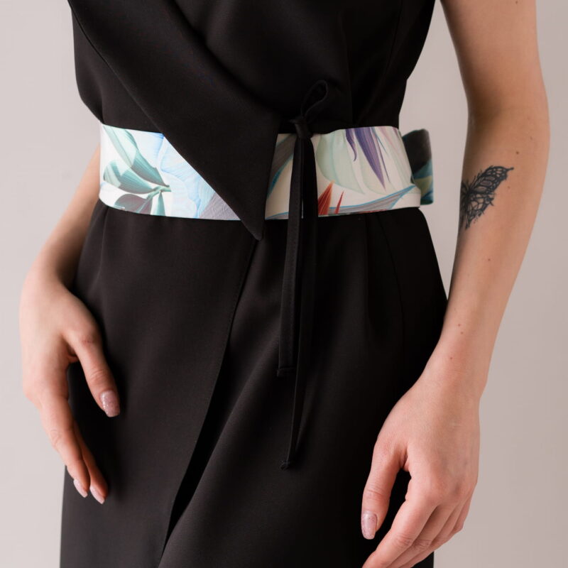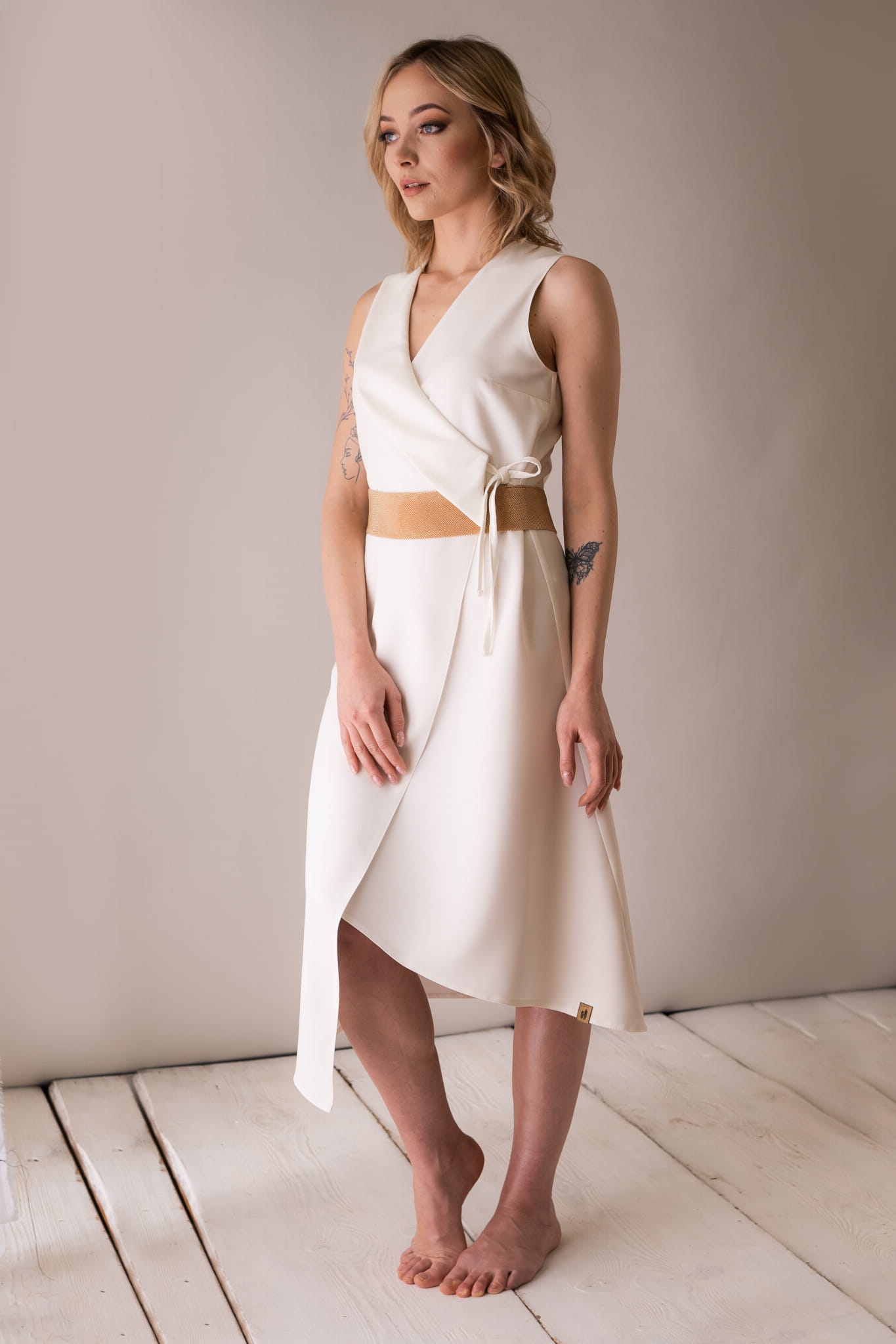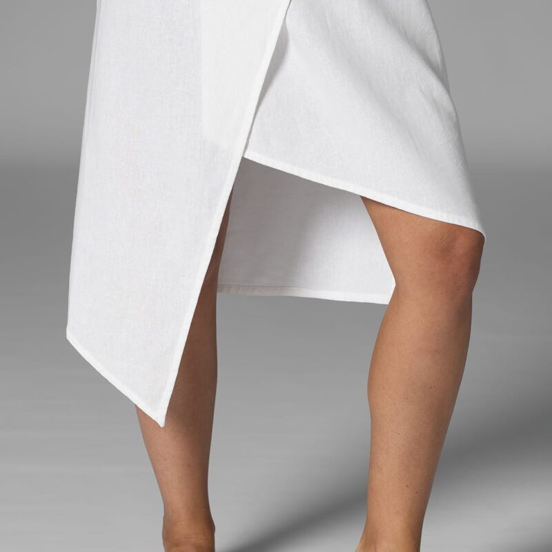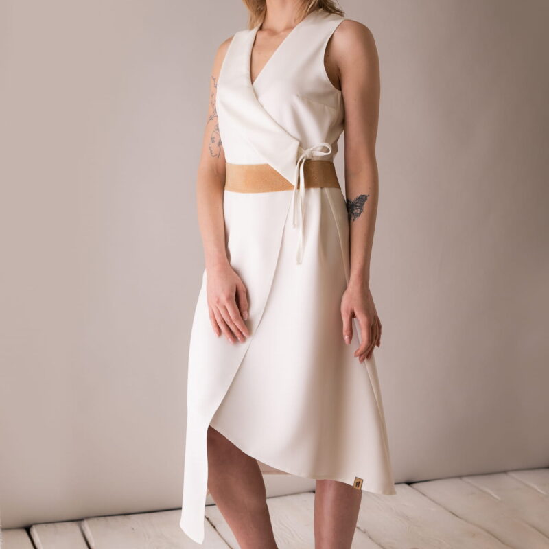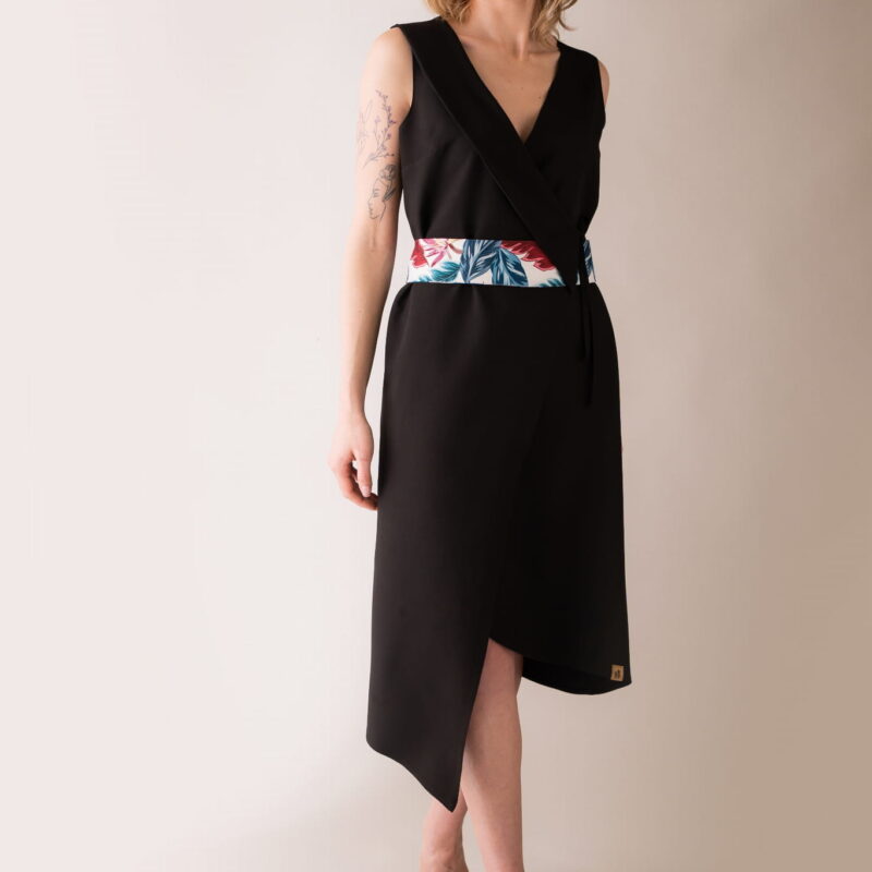 Asymetryczna sukienka z kołnierzem, wiązana na troczki, dzięki czemu w łatwy sposób można dostosować szerokość.