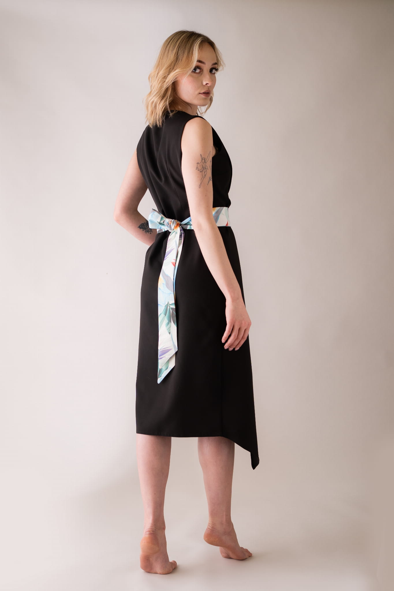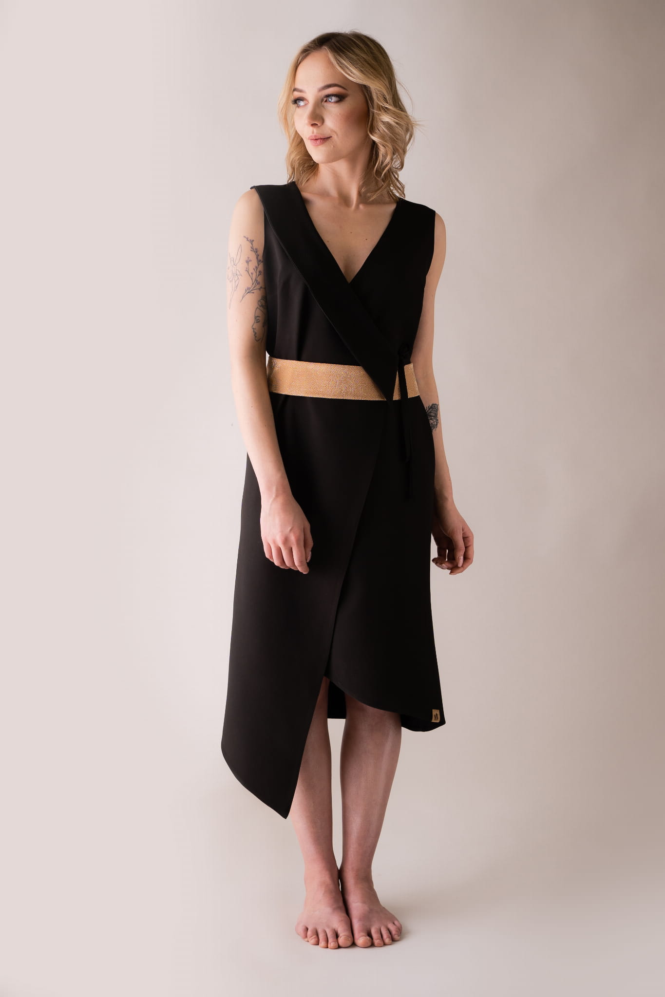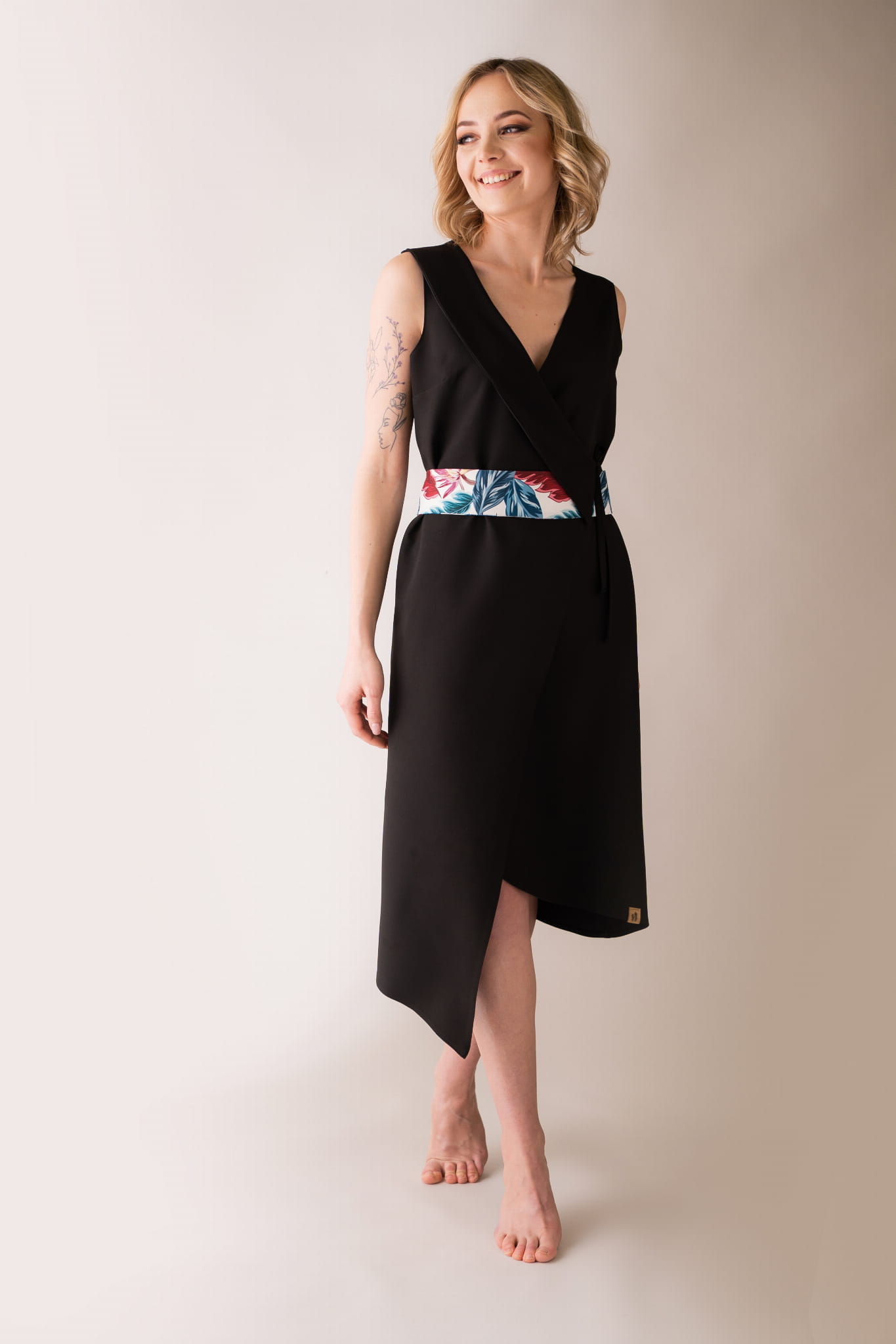 Asymetryczna sukienka – fartuch z kołnierzem, wiązana na troczki, dzięki czemu w łatwy sposób można dostosować szerokość.